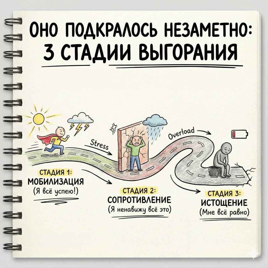 Что происходит на самом деле: Это стадия хронического стресса. Организм находится в постоянной боевой готовности (режим «бей или беги»), что истощает нервную и иммунную системы. Профессиональное выгорание здесь проявляется во всей красе: работа, которая раньше приносила удовлетворение, теперь вызывает только отвращение и чувство ловушки.