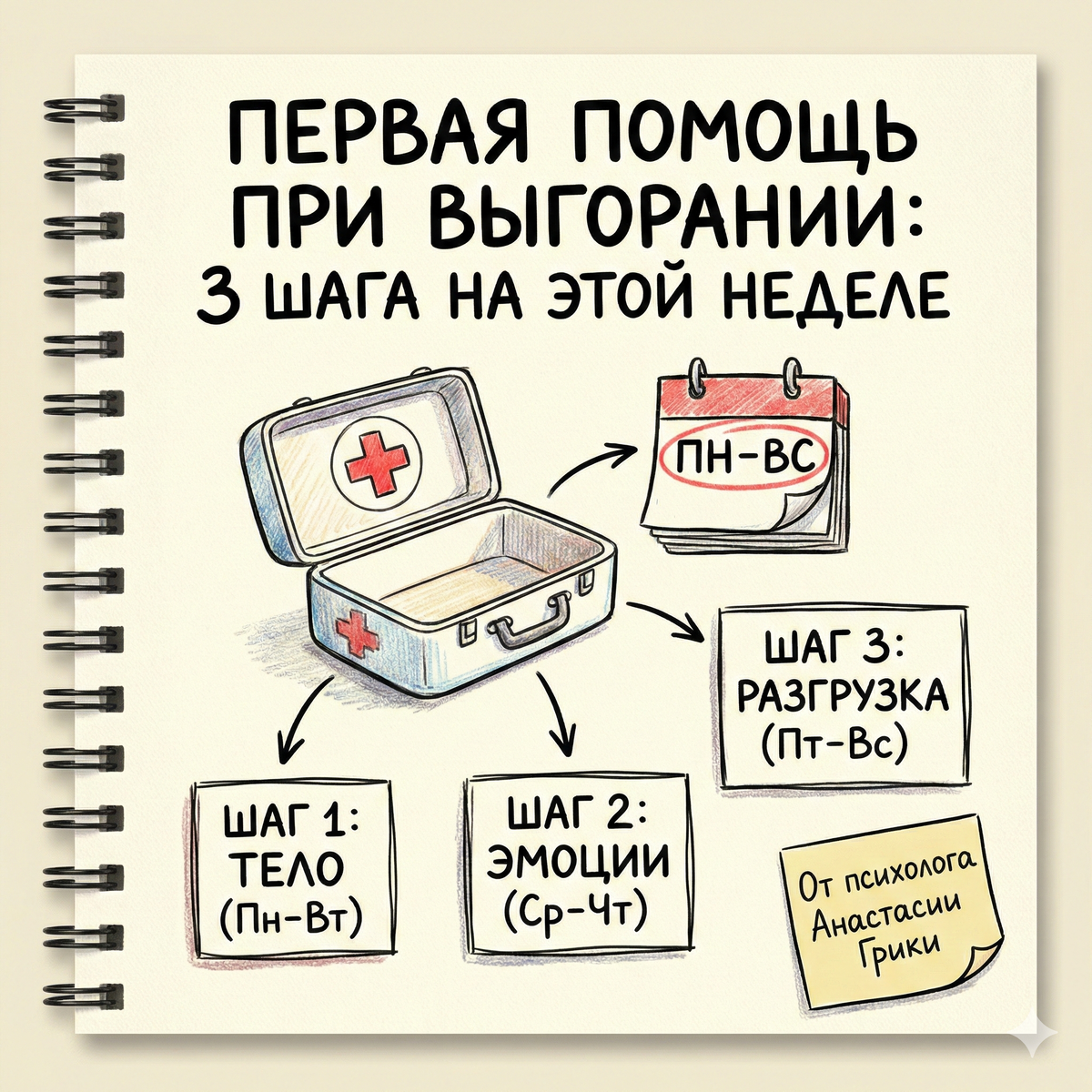 Сегодня, я, Анастасия Грика, психолог-консультант, дам вам четкий план первой помощи при выгорании. Всего 3 шага, которые нужно сделать на этой неделе. Они не решат всех проблем, но создадут опору, на которую можно будет опереться для дальнейшего восстановления.