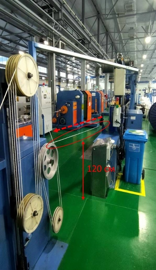 При переходе от одного приемного устройства к другому операторам приходится их обходить. В некоторых случаях рабочие наклоняются, проходя под кабелями, что не только создает риск повреждения продукции, но и может стать причиной травм сотрудников. Решение было логичным и простым: изменить маршрут движения заготовки, подняв принимающее устройство на высоту 2х метров. Результат: