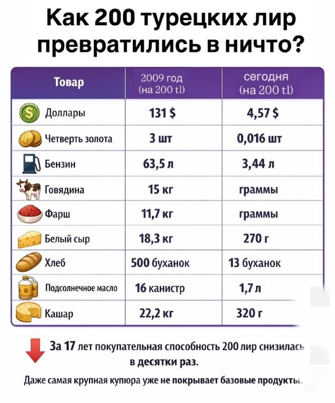 Представитель Cumhuriyet Halk Partisi (CHP) Булут на простых и понятных примерах показал, насколько изменилась покупательная способность 200 турецких лир за последние 17 лет. Цифры оказались нагляднее любых графиков. Доллар: минус почти всё Когда купюра номиналом 200 лир появилась в обращении в 2009 году, она соответствовала примерно 131 доллару США. Сегодня около 4,5 доллара. Фактически крупнейшая банкнота страны потеряла более 95% своей долларовой стоимости. То, что раньше было ощутимой суммой, теперь несколько купюр на повседневные мелкие расходы. Золото: из «почти монеты» в «крошку» В 2009 году на 200 лир можно было купить примерно ¾ золотой монеты çeyrek altın. Сегодня лишь около 0,016 такой монеты. Если четверть золотой монеты сейчас стоит около 12 350 лир, для её покупки нужно принести в ювелирный магазин 62 купюры по 200 лир. То, что раньше покупалось буквально за несколько банкнот, сегодня требует целую пачку денег. Бензин: с полного бака до нескольких литров В 2009 году 200 л