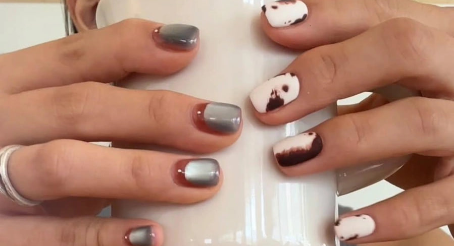 Одинаковые ногти на обеих руках? Это скучно. В этом году в моде другой тренд — разные дизайны на правой и левой руке. Такой маникюр не только привлекает внимание, но и становится полноценным аксессуаром. Он добавляет образу индивидуальность, делает его более живым и позволяет сочетать сразу несколько трендов, не тратя время на мучительный выбор. Контрасты сейчас особенно в цене. Минимализм можно столкнуть с ярким акцентом, графику — с сиянием, спокойный тон — с объёмным эффектом. Если давно разрываетесь между двумя идеями, просто разделите их по рукам. Это выглядит свежо и не перегружает образ. Один из самых эффектных дуэтов — коровий принт и «кошачий глаз». Первый отвечает за дерзость и немного иронии, второй добавляет глубины и света. Вместе они создают тот самый маникюр, который хочется рассматривать при любом удобном случае. Начнём с коровьего принта. Он выглядит ярко, но в исполнении не требует ювелирной точности. Сначала стандартная подготовка: форма, аккуратная кутикула, прозра