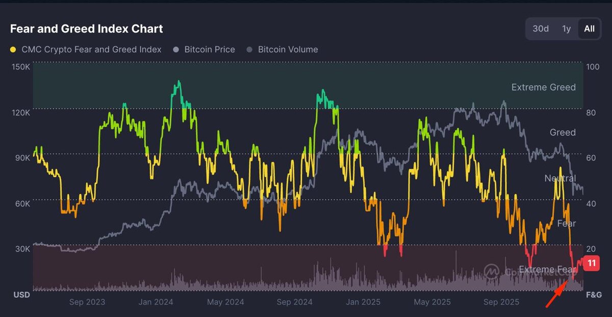 😰 Индекс страха и жадности находится на самом дне по графику CoinMarketCap