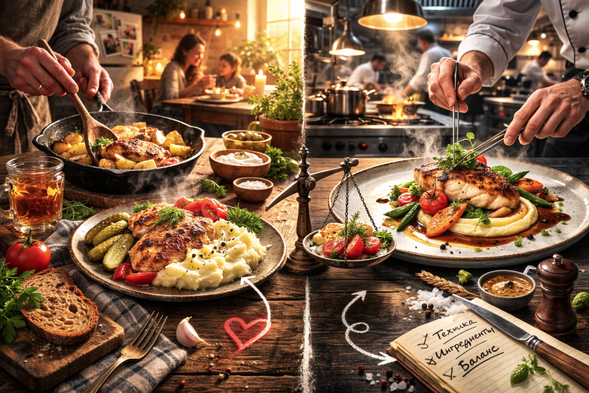 Я замечаю ещё одну деталь. Когда я готовлю дома, я пробую по ходу. Я могу снять с огня чуть раньше, если мне нравится так. Я не обязан соблюдать стандарт. А в ресторане стандарт обязателен. Там важна повторяемость. Дома важна индивидуальность.