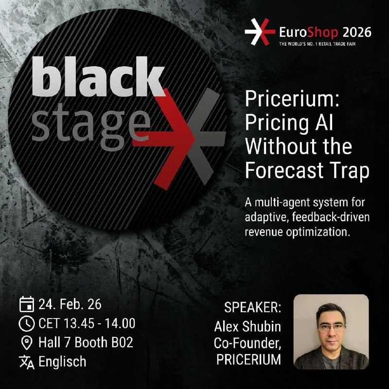 ! Давайте вместе переосмыслим ценообразование! ⚡ Сессия Pricerium: “Ценообразование ИИ без прогнозной ловушки” 👤 Спикер: Александр Шубин 📍 Чёрная сцена, зал 7, стенд B02 🕐 Сегодня, 24 февраля, 13:45–14:00 (CET) Узнайте, как мультиагентный ИИ принимает прозрачные решения по ценообразованию в реальном времени — без ненадёжных прогнозов и при соблюдении коммерческих правил. Максимизируйте прибыль, выручку и продажи, сохраняя контроль над стратегией. Идеально для лидеров ритейла, специалистов по ценообразованию и технологических новаторов, ищущих подход нового поколения. #EuroShop #RetailAI #PricingStrategy #AIPricing #RetailTech #Pricerium