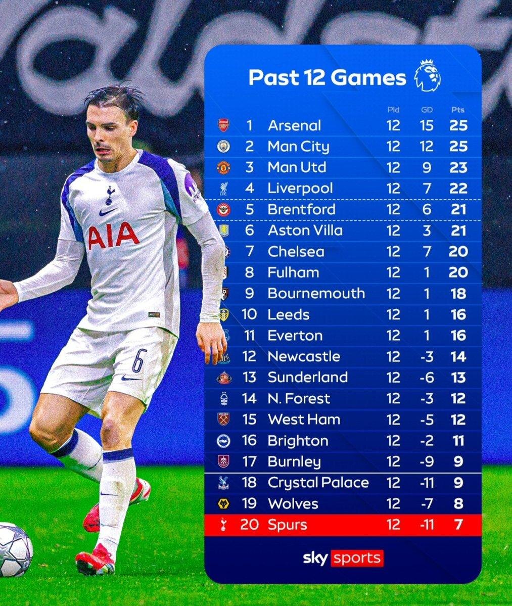 Турнирная таблица Премьер-Лиги по 12 последним матчам 📊