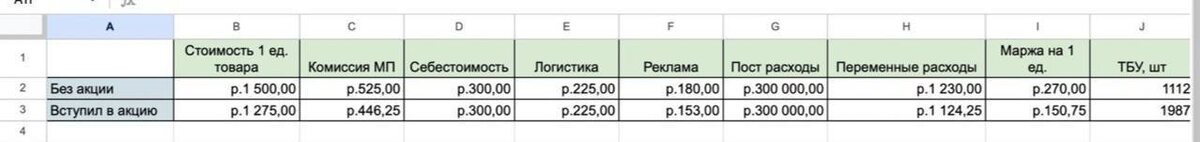 ✋ Надеюсь многие решили задачку правильно🧠 Разбираем решение: ➡️ До вступления в акцию Цена — 1 500 руб. Считаем условно переменные расходы: • Комиссия 35% = 525 руб. • Себестоимость 20% = 300 руб. • Логистика 15% = 225 руб. • Реклама 12% = 180 руб. Итого переменные расходы: 525 + 300 + 225 + 180 = 1 230 руб. Маржа с 1 штуки: 1 500 – 1 230 = 270 руб. Постоянные расходы — 300 000 руб. Точка безубыточности: 300 000 / 270 = 1 112 штук, чтобы выйти в ноль. ➡️ После вступления в акцию (-15% к цене) Новая цена: 1 500 × 0,85 = 1 275 руб. Пересчитываем условно переменные расходы: • Комиссия 35% = 446 руб. (От фактической цены продажи) • Себестоимость = 300 руб. (Не меняется) • Логистика 15% = 225 руб. (Стоимость логистики не изменится при снижении цены и остается в рублях прежней) • Реклама 12% = 153 руб. И вот тут у многих маркетплейсная ошибка. Считают ДРР от прошлой цены. А надо от новой. Почему? Потому что со снижением цены улучшаются конверсии (а значит и снижаются расходы на ре