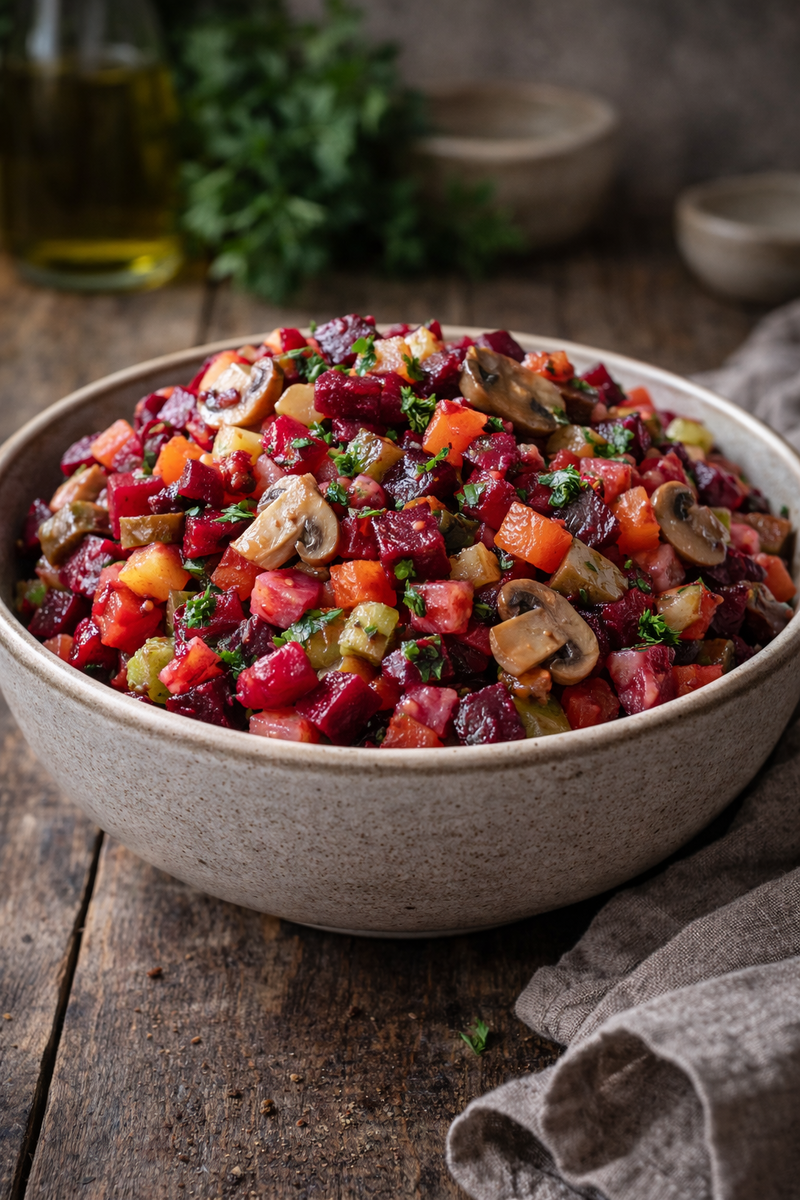 Это про осознанность, спокойствие и более простую еду. И один из самых удачных вариантов для первых дней — винегрет. Но не классический, а с грибами. Он получается более глубоким по вкусу, сытным и по-настоящему домашним. Такой салат можно подать и к обеду, и к ужину. Он хорошо хранится и становится даже вкуснее на следующий день. По желанию — немного квашеной капусты. Свёклу, картофель и морковь отварите до готовности.