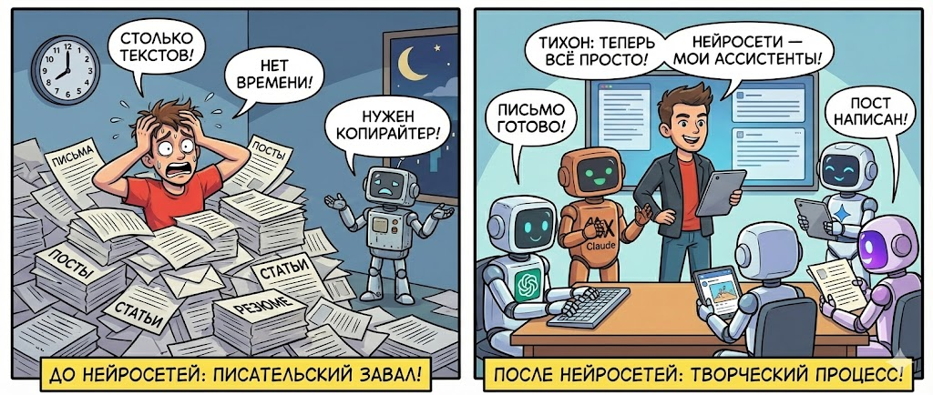 Тексты окружают нас везде: письма коллегам и клиентам, посты в соцсетях, статьи для блога, описания товаров, резюме, коммерческие предложения. Раньше каждый текст приходилось писать самостоятельно или платить копирайтеру. Теперь нейросети берут на себя черновую работу — от первого наброска до финальной редактуры.
