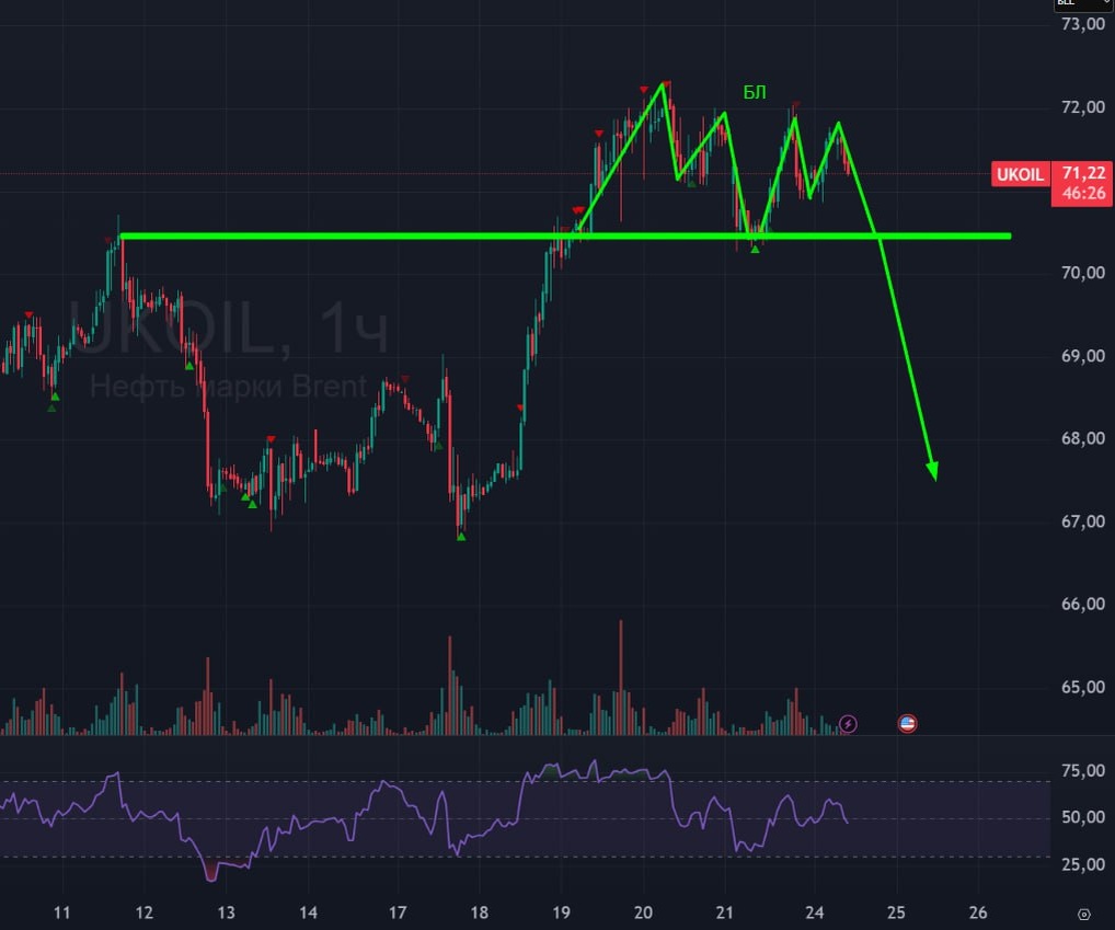 🛢 Нефть 🟢 Вчера рисовал бычью ловушку, но ее выкупили. Тем не менее, взгляд не изменился, жду вот такую бычью ловушку. Весь рост на заголовках СМИ о том, что на прошедших выходных будет война между США и Ираном, жду на откат до основания разгона. На этой неделе переговоры могут уже сделать это снижение. А так же в воскресенье встреча ОПЕК+, которая может дать директиву на увеличение добычи нефти, что может придать ускорение снижению нефти. Если в нейти начнется активное снижение, то это заденет и наш рынок, который сейчас улетел выше 2800. 🚗 Жду активное снижение цен на нефть после формирования бычьей ловушки #нефть #brent #br1 #bogdanoffinvest $BRH6 $BRJ6 $BMH6 $BMJ6 $BRK6 $BMK6