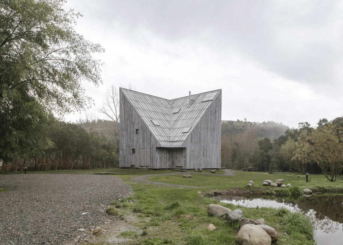 Этот проект — упражнение на семейную дихотомию. Начиная с куба со стороной 11 метров, две грани которого разделены пополам, весь проект вращается вокруг соединения противоположных пар. Два больших фасада открывают вид на озеро и территорию первого этажа, два меньших почти полностью слепы и закрывают вход в нижнем углу. Этот проект был выполнен 10 лет назад и только два года назад было принято решение о начале его реализации. Несмотря на всё это время, и требования заказчика и участок остались прежними. Клиенты — пара, никогда не жившая вместе, каждый из них живёт в своей квартире всего в нескольких метрах на одной улице столицы. Таким образом, в этом доме для отдыха их кровати впервые будут расположены под одной крышей. Расположен на юге Чили, на естественной поляне на длинном участке земли, заканчивающемся озером. С одной стороны его окружает ряд деревьев, а с другой — небольшой ручей. Высота деревьев и густые низкие кусты дезориентируют любого, кто пытается найти какой-либо элемент