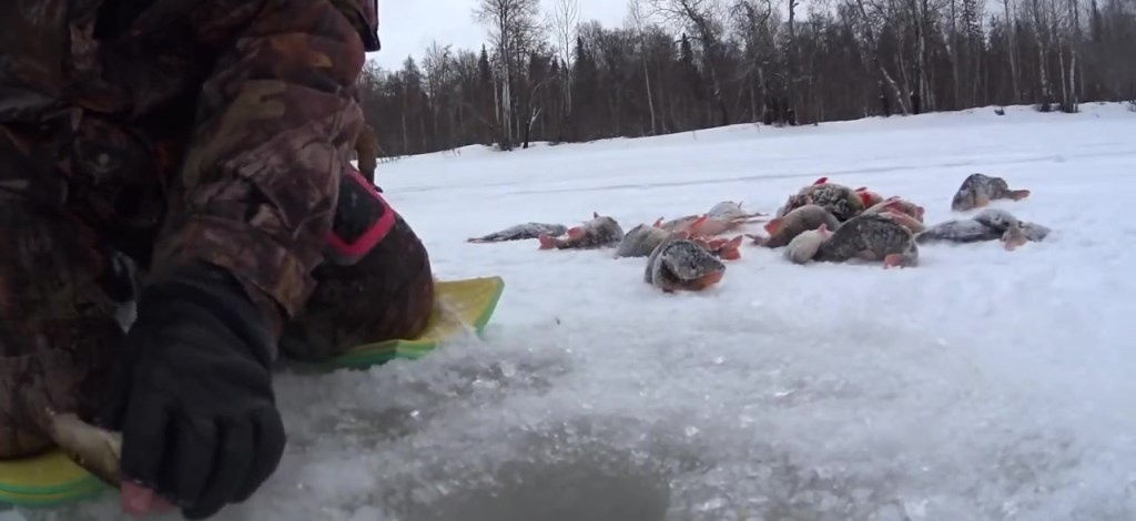 Рыбу небольших размеров вытащить из лунки легко. Если же рыба крупная и с трудом пройдет через отверстие, то лучше не спешить. Она может резко дернуться от дневного света и сорваться с крючка. Надо посыпать в лунку крошки льда со снегом и осторожно поднимать рыбу. Когда ее голова появится над водой, то быстро схватить ее под жабры и вытащить на лед.