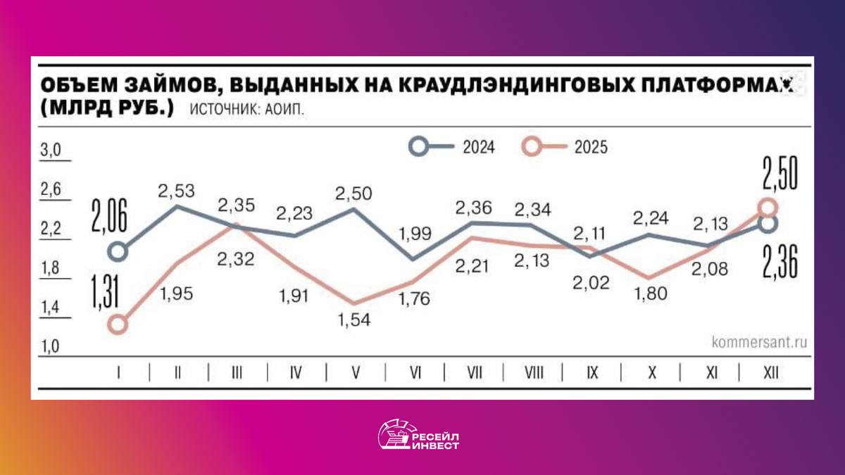 По итогам 2025 года инвестиционные платформы выдали 23,66 млрд рублей, почти достигнув уровня рекордного 2023 года (24,08 млрд). Главный драйвер — резкий рост в декабре: 2,5 млрд против 2,08 млрд в ноябре. Рынок доказал устойчивость, несмотря на жесткую денежно-кредитную политику ЦБ и высокую ключевую ставку. Формат краудлендинга для бизнеса окончательно превратился из альтернативы в востребованный инструмент финансирования. Что говорит наш эксперт Юлия Новожилова, генеральный директор «Ресейл-Инвест»: «Сам факт приближения к рекорду говорит о зрелости рынка. Качество заемщиков ухудшается с 2023 года, поэтому главный приоритет платформ — контроль рисков и минимизация дефолтности. Мы прогнозируем, что в ближайшие 2-3 года количество бизнесов на краудлендинговых платформах будет расти на 30–50% ежегодно. Также мы ожидаем роста интереса со стороны институциональных инвесторов — сейчас их доля составляет всего 10% от общего числа.» Для предпринимателей сегодня открывается новый, доступный