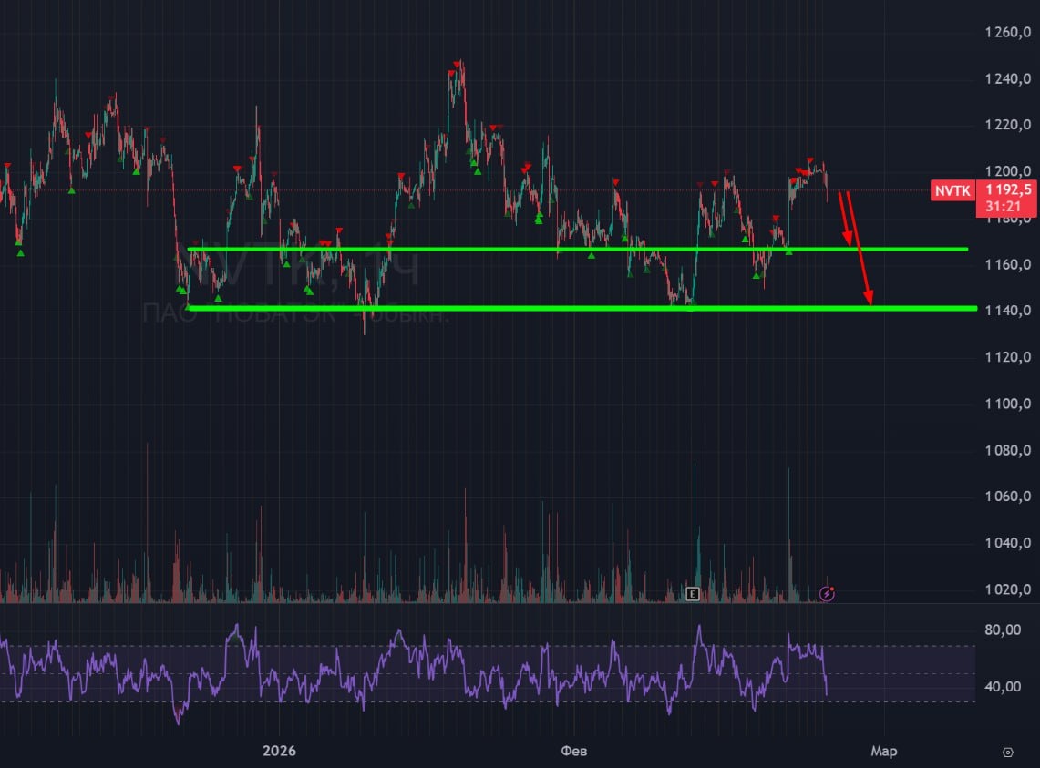 ! 🟢В Новатэке уже началась раздача. Кажется, народ начинает понимать, что заявления американского бизнесмена с фамилией Бич о том, что Новатэк может применять свои технологии на Аляске в неизвестном будущем, вилами на воде писаны. Вместо утренней эйфории тут идет откат. 🚗 Развал рынка и Новатэка я не жду, но умеренную коррекцию до 1168 или 1140 вполне можно было бы увидеть. #Новатэк #NVTK #bogdanoffinvest $NVTK $NVH6 $NVM6
