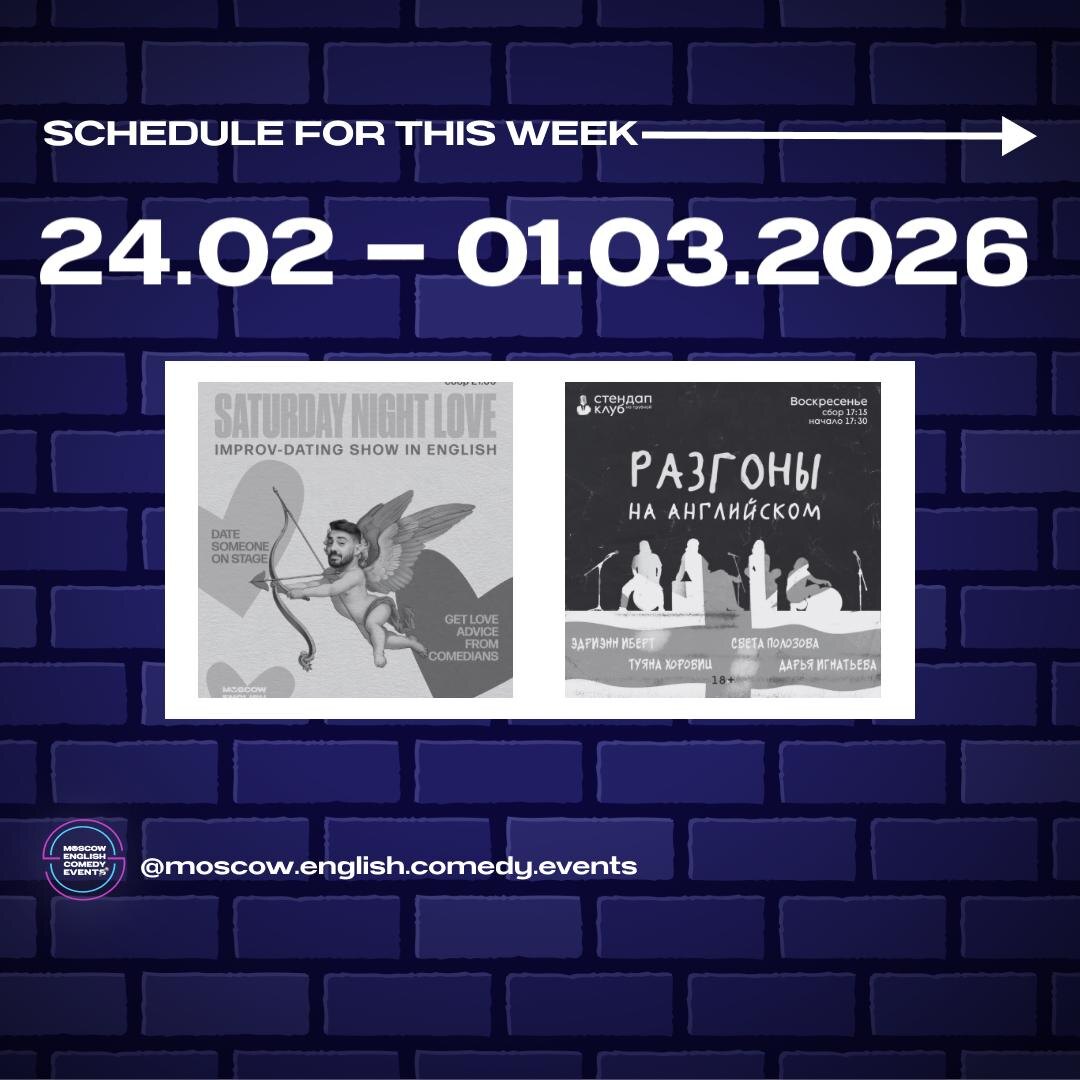 🌹Improvised dating show 💵Entrance: 750 rub 🔗 Buy tickets here 📍Still StandUp Moscow 🗺 Pokrovka 17c5, through the arch with the pink lights 🏙 Blue building directly inside the courtyard -----‐----------------------- 🕠Sunday March 1st, 5:30 PM - Разгоны на английском 🍿Panel of comics riffs off each other's jokes and ideas 🎟️Entrance: FREE 💸 Donations welcome, one drink minimum 🔗Reserve for free 📍Стендап Клуб на Трубной 🗺 Map: Rozhdestvensky Blvd, 10/7 С1