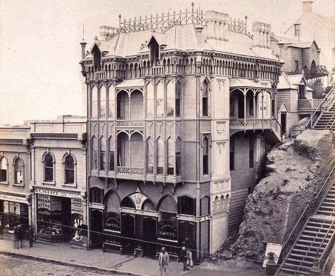 Отель «Ориентал» в Данидине, Новая Зеландия, построен в 1863. Пережил четыре крупных пожара, снесен в 1887 году.