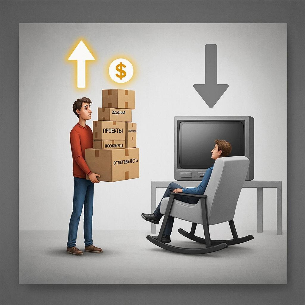 Вторая мысль, после того как выпустил пар: «А действительно... почему?». Я оглядел контору. 15 человек. Кто-то пьёт чай, кто-то смотрит в телефон, кто-то делает вид, что работает. И только я и парень из соседнего отдела (которого тоже, кстати, нагрузили) реально тащим. Не потому что нас любят, а потому что мы сделаем. Остальным можно поручить — они «забудут», «не успеют», сделают тяп-ляп. И тут меня осенило. Знаменитая фраза Кийосаки «Богатые богатеют, а бедные беднеют» заиграла совершенно новыми красками. Кийосаки имел в виду активы и пассивы. Но я увидел бытовую проекцию: Не в смысле денег. В смысле жизненной позиции. Нас 15 человек. 13 — «зрители». Они наблюдают, как двое «актёров» разбираются с проблемами. И это работает во всех сферах: Ответственность — это магнит для возможностей. Чем больше ты берёшь на себя (и делаешь хорош