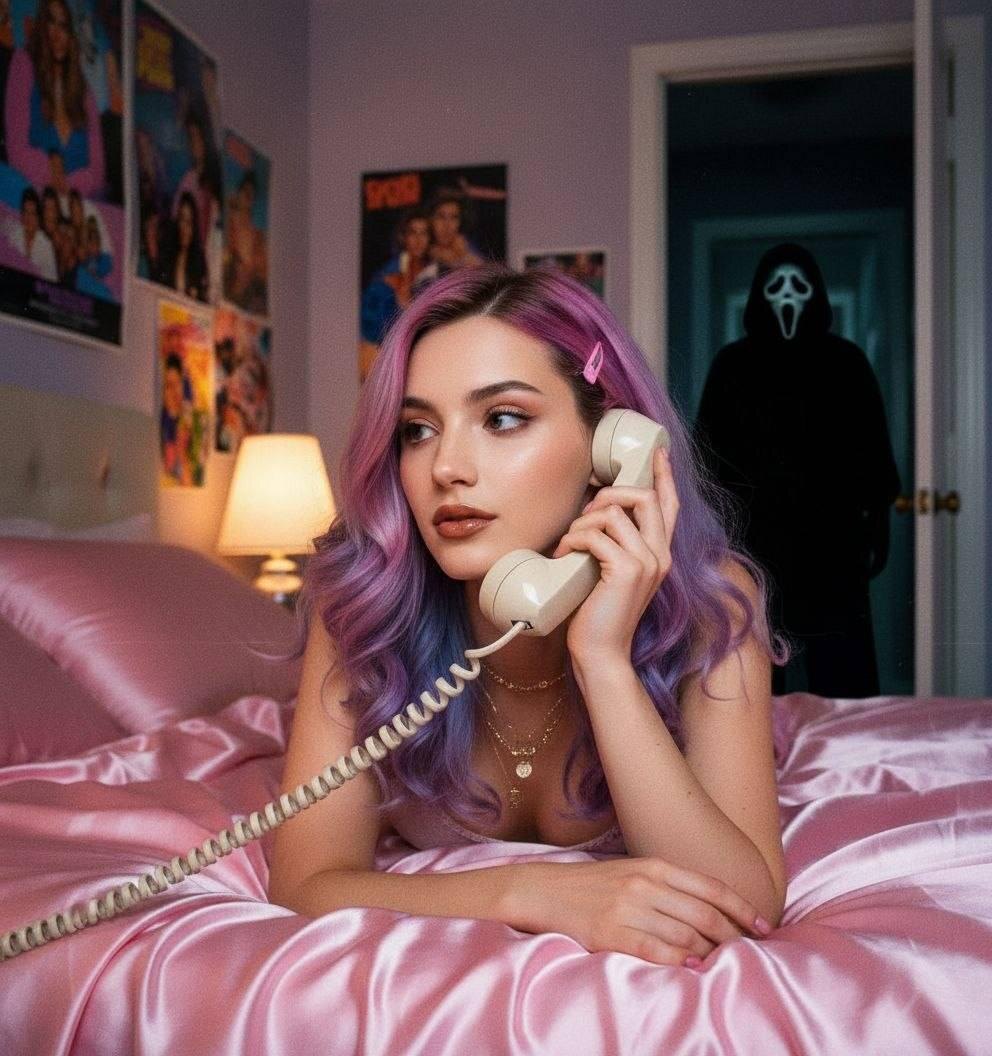 В кадре — персонаж, вдохновлённый атмосферой фильма «Крик»: мягкий свет, приглушённые тени и таинственная эстетика с намёком на напряжение. Сгенерировать фото🪄 Фотография в мечтательном стиле Y2K: я лежу на блестящем розовом атласном постеле, держа в руках большой проводной телефон в стиле 90-х, в задумчивой, мечтательной позе. Волосы свободно ниспадают локонами, украшенными розовыми заколками по бокам. На мне изящные украшения, включая тонкие золотые ожерелья. Комната позади меня девичья и мечтательная, с постерами в стиле 90-х. Макияж простой, но гламурный: коричневый блеск для губ и коричневый карандаш для губ. Фотография должна иметь зернистый стиль 90-х с источником света, например, лампой в тускло освещенной комнате ночью. За ней стоит Призрачное Лицо из фильма, смотрящее на нее, его тело тускло освещено, он стоит в дверном проеме тускло освещенного коридора. Фон позади него должен быть слегка темным и зловещим. Старайтесь сохранить черты лица максимально близкими к оригиналу,