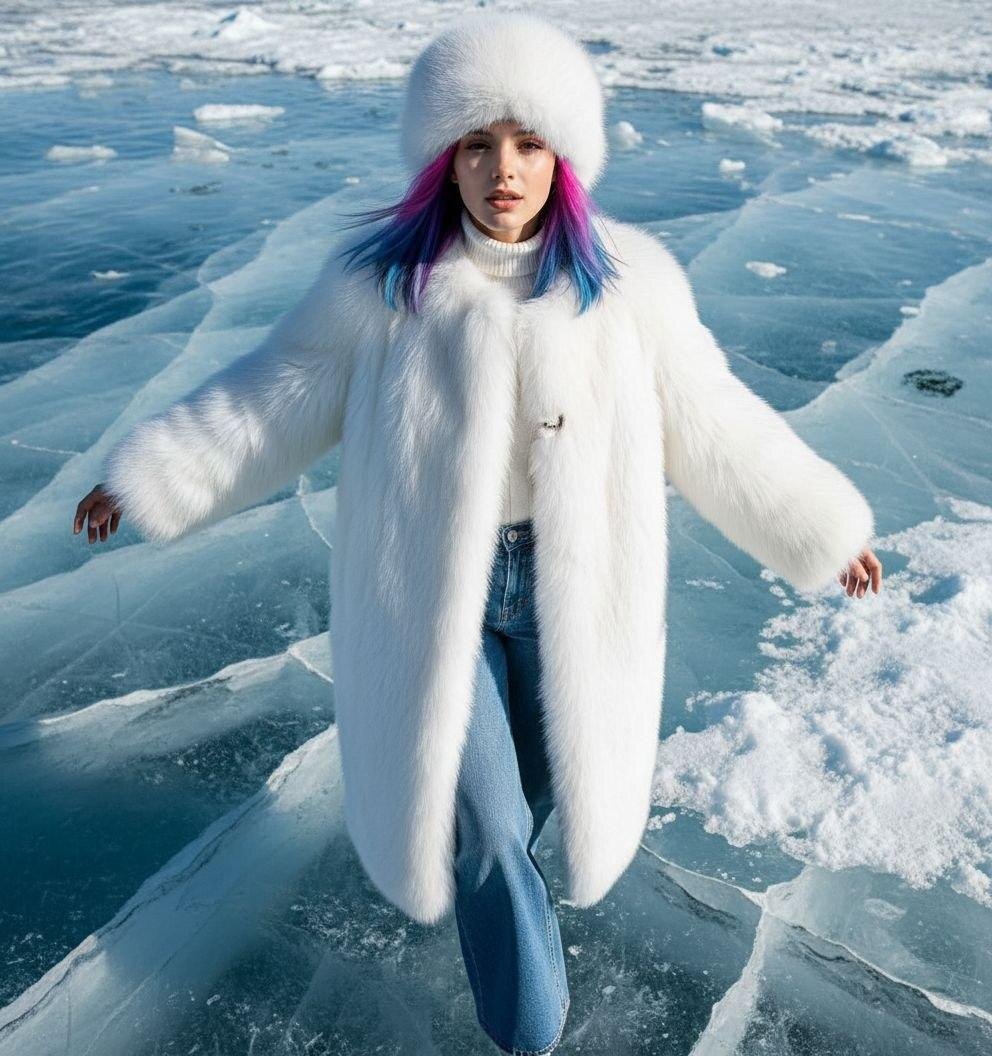 Персонаж идёт по растрескавшемуся леднику, точное лицо сохранено без изменений. Образ — длинная белая меховая шуба, массивная меховая шапка, белая водолазка и широкие синие джинсы. Жёсткий холодный дневной свет, глубокие тени и блеск ледяных кристаллов усиливают реализм. Лёгкий ветер приподнимает мех и пряди волос, а трещины льда с голубыми глубинами формируют атмосферу высокодетализированной арктической модной съёмки. Сгенерировать фото🪄 Используйте загруженное селфи для лица. Точное воспроизведение 1:1 — воспроизведите геометрию лица, пропорции, выражение и цвет волос; не приукрашивайте и не стилизуйте. Сверхдетализированный крупный план в стиле фэшн-редакции: та же женщина осторожно идёт по потрескавшемуся льду ледника, глядя прямо в камеру. На ней массивная длинная белоснежная меховая шуба, соответствующая ей большая белая меховая шапка, широкие синие джинсы и толстая белая водолазка. Руки слегка разведены для равновесия; её тень видна на льду. Освещение: жёсткий, холодный дневн