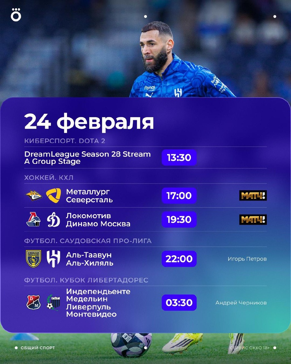 Кроме стыков в ЛЧ готовимся смотреть киберспорт, КХЛ, матч «Аль-Хиляля» в Саудовской Про-лиге и квалификацию в Кубке Либертадорес 🏆