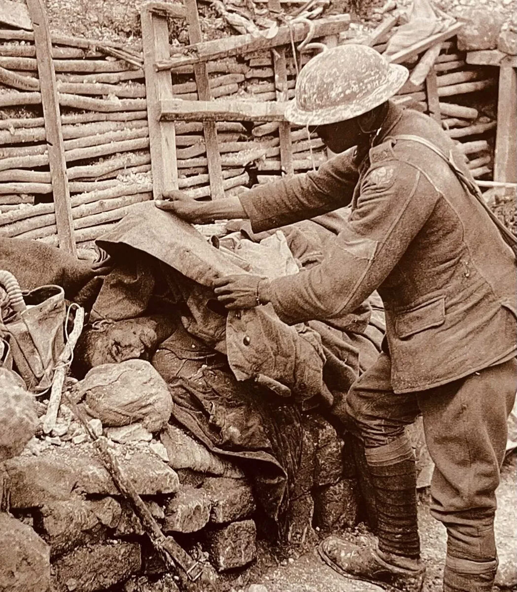 Британский солдат накрывает тело павшего немца на посту захваченного окопа близ Овиллера во время битвы на Сомме, 1916 год.