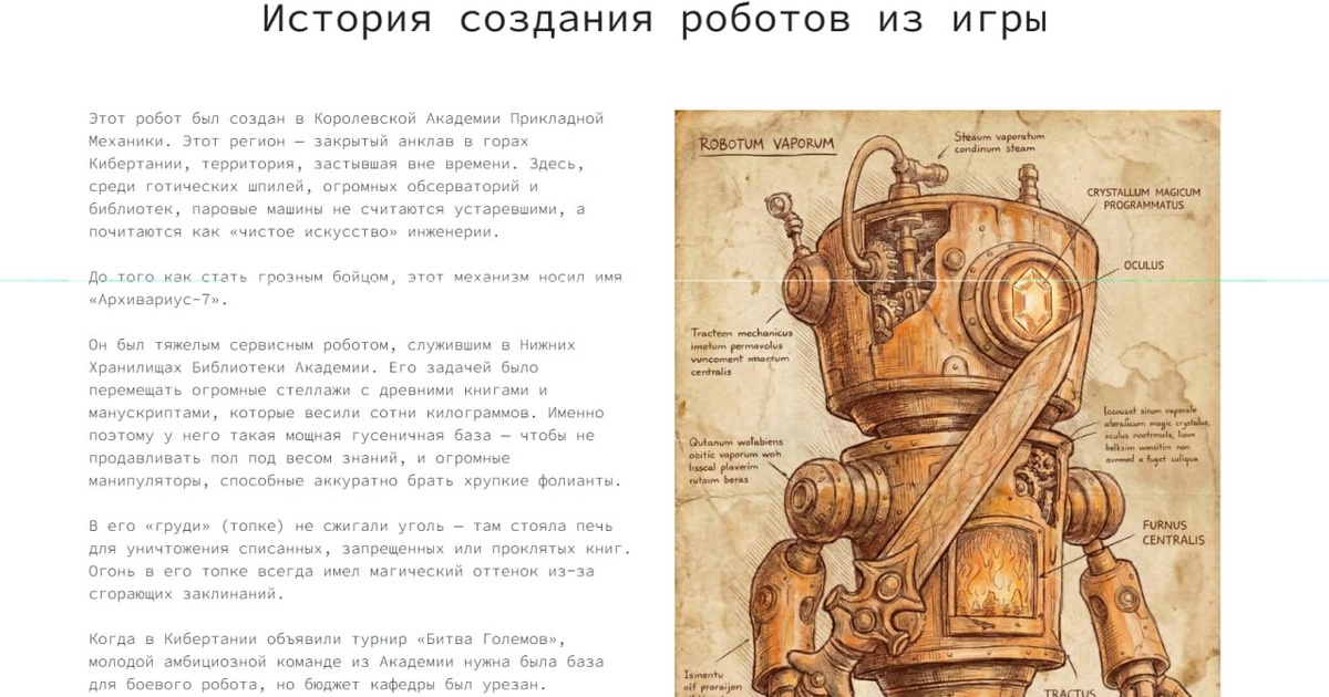 Для нашей игры Битва Големов v4.0 мы добавили истории создания каждого робота