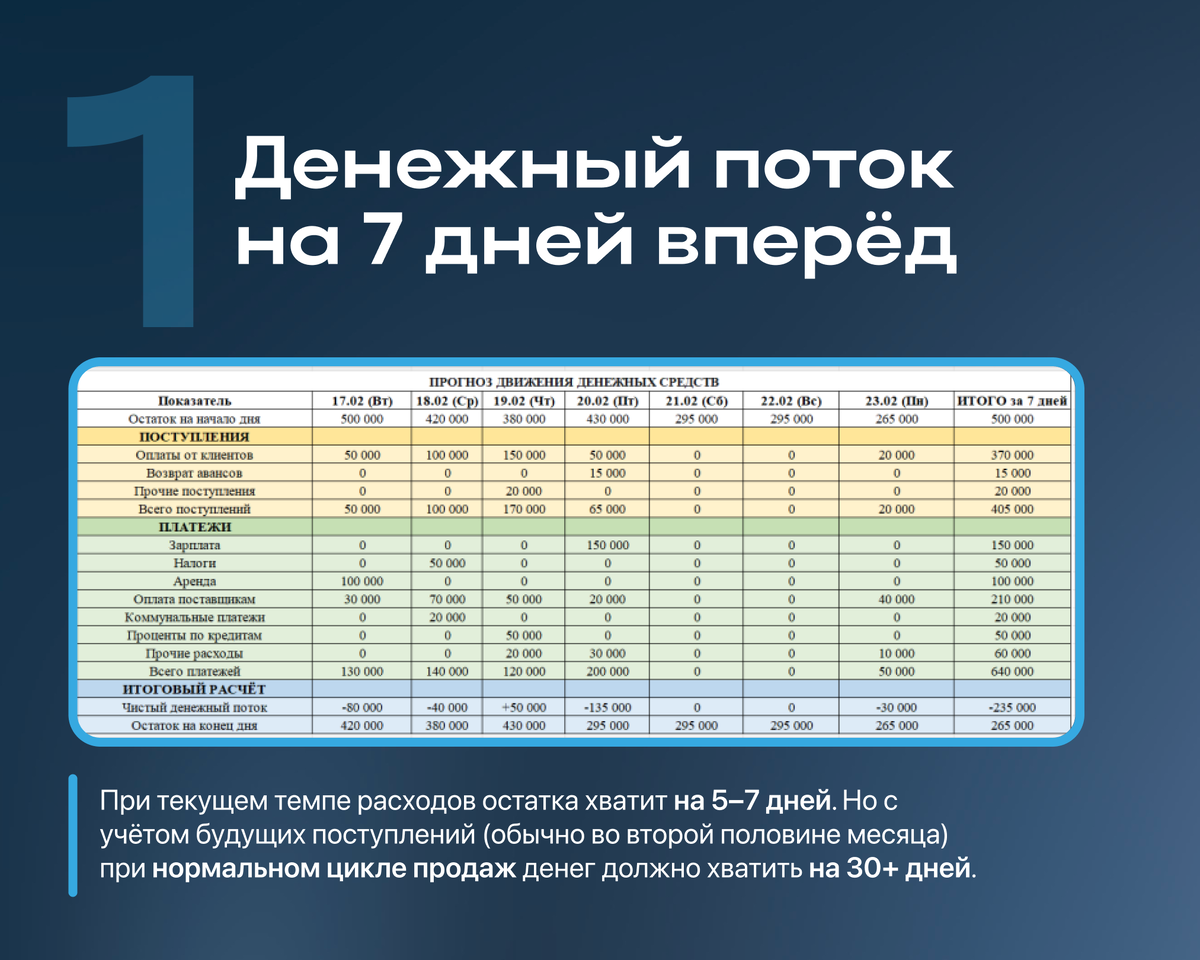 Идеал: «денег хватит до (дата)» — и эта дата не раньше, чем через 30 дней.