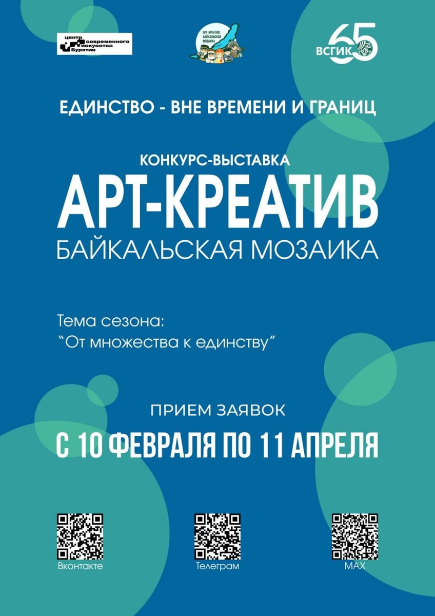 » Конкурс «Арт-креатив: Байкальская мозаика» направлен на поддержку и мотивацию к творческой деятельности начинающих художников и кураторов, а также на формирование единого культурного пространства, объединяющего разнообразие художественных практик, взглядов и индивидуальных высказываний. Номинации и тематика Конкурса В 2026 году Конкурс посвящён теме «От множества к единству», отражающей идею целостности, взаимосвязи и диалога между разными культурами в современном мире. Мир состоит из множества элементов: людей, культур, смыслов, форм, состояний и точек зрения. Однако именно во взаимодействии, соприкосновении и объединении этого разнообразия рождается целое. Участникам предлагается художественно осмыслить путь от разрозненности к целостности: - от индивидуального к коллективному; - от фрагмента к образу; - от различия к гармонии. Это может быть выражено, например: через природные мотивы Байкальского региона; образы человека и сообщества; образы от индивидуального к коллективному; в