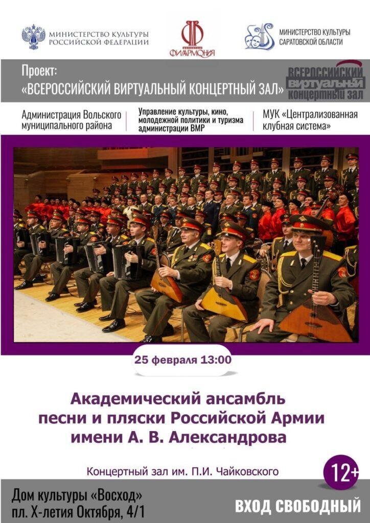 25 февраля в 13:00 в Доме культуры «Восход» (пл. Х-летия Октября, 4/1) состоится трансляция концерта Академического ансамбля песни и пляски Российской Армии имени А. В. Александрова. Запись была сделана в одном из лучших залов страны — Концертном зале им. П. И. Чайковского.