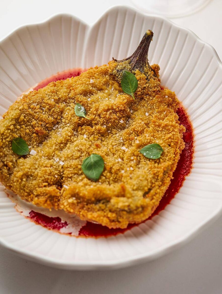 Один баклажан, два вида томатов, страчателла и хрустящая панировка.