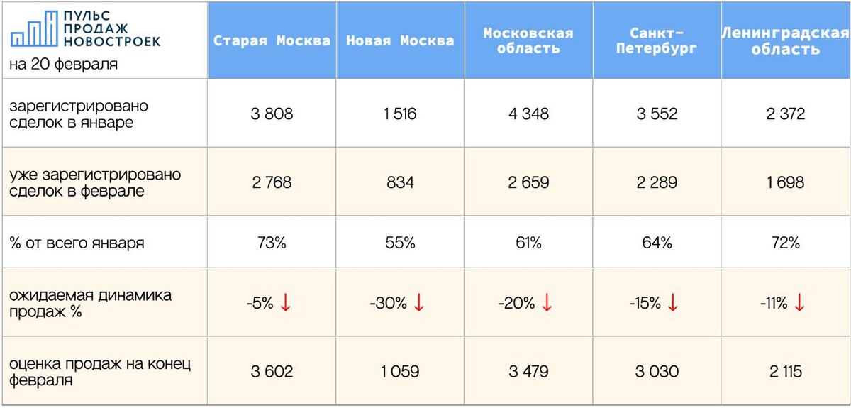 📈 Данные в таблице. Кратко: 🔽Старая Москва: уже прошло регистрацию порядка 2 768, прогноз -5% (3 602 ДДУ за февраль) 🔽Новая Москва: 834 сделки, прогноз -30% 🔽Московская область: 2659 сделок, прогноз -20% 🔽Санкт-Петербург: 2289 сделок, прогноз -15% 🔽Ленинградская область: 1698 сделок, прогноз -11% 🔥 @pulsprodaj