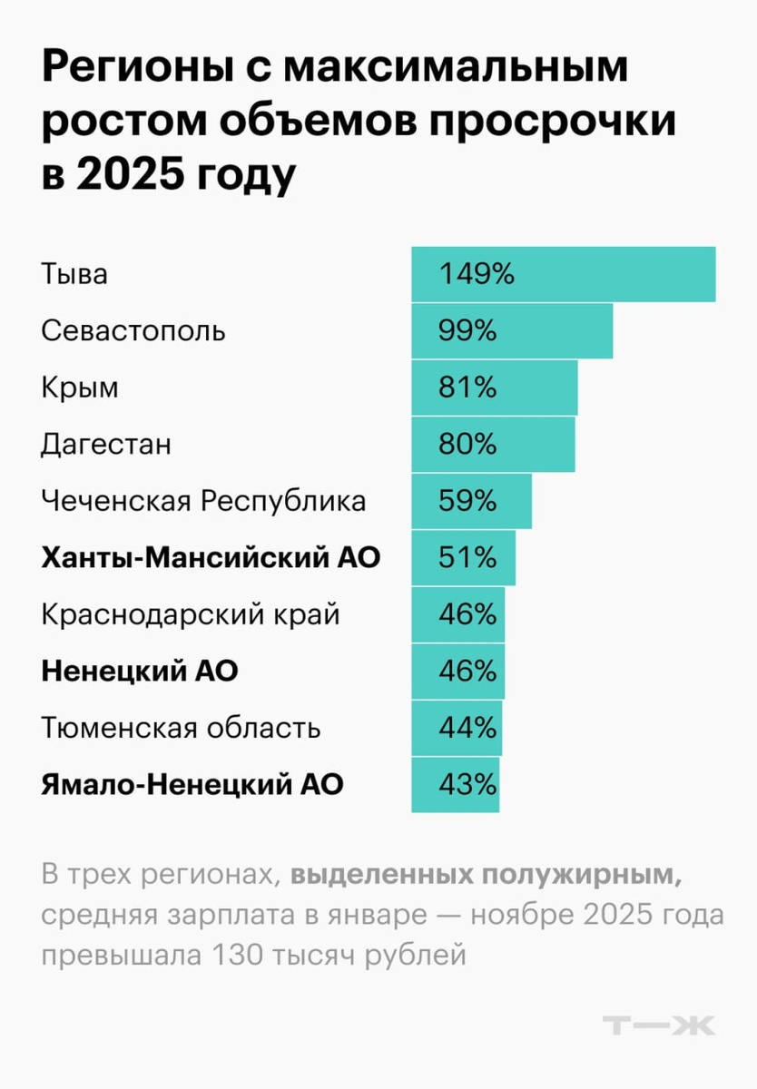 %). 💰 Самые дисциплинированные заемщики — ипотечники: в этом сегменте проблемный лишь один из 60 кредитов. 💰 Среди регионов лидер по долгам — Ингушетия. У ее жителей просроченная задолженность составляет 26% портфеля, тогда как средний показатель по стране — 4,6%. 💰 Прилежнее всех кредиты платят в Крыму, Севастополе и Санкт-Петербурге. Почему россияне стали хуже платить по кредитам: https://t-j.ru/tg/who-pays-worst/