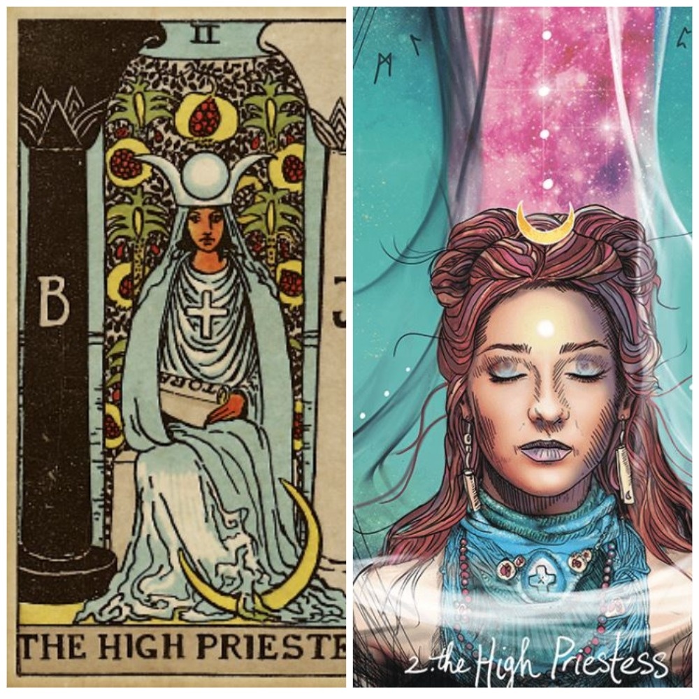 Символы Верховной Жрицы – свиток в руках (часто с надписью «Тора»), луна у ног, колонны черного и белого цвета и занавес за спиной, который скрывает водную гладь. Это говорит о главном качестве Жрицы: она стоит на границе миров. Она – проводник между сознательным и бессознательным, между явным и тайным.