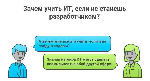 Дорогие студенты! Если вы сейчас учитесь на ИТ-специальности и думаете: «Зачем мне эти алгоритмы, эти паттерны проектирования, эта теория объектно-ориентированного программирования, если я не хочу быть программистом?» - задумайтесь об одной простой вещи.