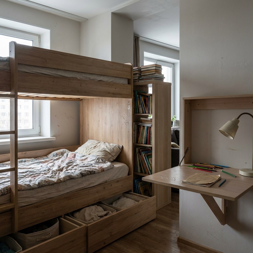 Вот три реальные истории семей, которые обустроили малогабаритные квартиры с разными бюджетами. Семья Ковалёвых: 38 м², двое детей, 85 000 рублей Однушка за МКАДом для четырёх человек. Решение: двухъярусная кровать-трансформер (45 000), диван-трансформер (32 000), складной стол (8 000). Результат: каждый получил свою зону. Ошибка: сэкономили на фурнитуре — диван скрипит через полгода. Семья Петровых: 28 м² студия, 180 000 рублей Мать-одиночка с дочкой. Шкаф-кровать с антресолями, стеллаж-перегородка, кровать-чердак. Студия не кажется тесной благодаря зонированию. Семья Новиковых: 44 м², трое детей, 340 000 рублей Индивидуальный проект с фурнитурой Blum и Hettich. Работает без нареканий два года. Вывод: качественная фурнитура служит годами. Планируете обустройство? МебельСнов создаёт индивидуальные проекты с замером и фурнитурой Blum под ключ 🏠
