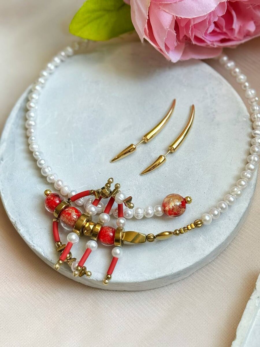 🔥 Жемчужная база здесь только фон. Главная роль — за красными акцентами и золотыми деталями с острыми линиями. Они будто говорят: «я хочу выделяться». Этот комплект подойдёт тем, кто любит дерзость в деталях, кто любит яркую помаду и днём и вечером, и не прячет своё настроение!💃 Колье 6900 Серьги 4300 ✨Нажмите для заказа ✉️ Нажмите чтобы задать вопрос