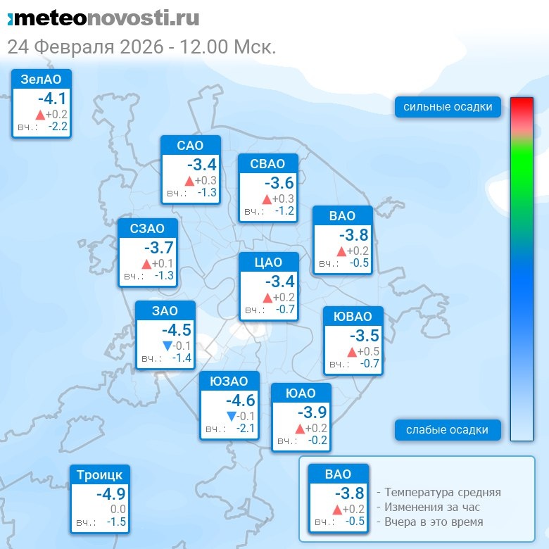 В 12:00 в Москве было от -5.3°C до -2.7°C, средняя температура -3.8°C #погода #Москва #зима #температура #24февраля #вторник