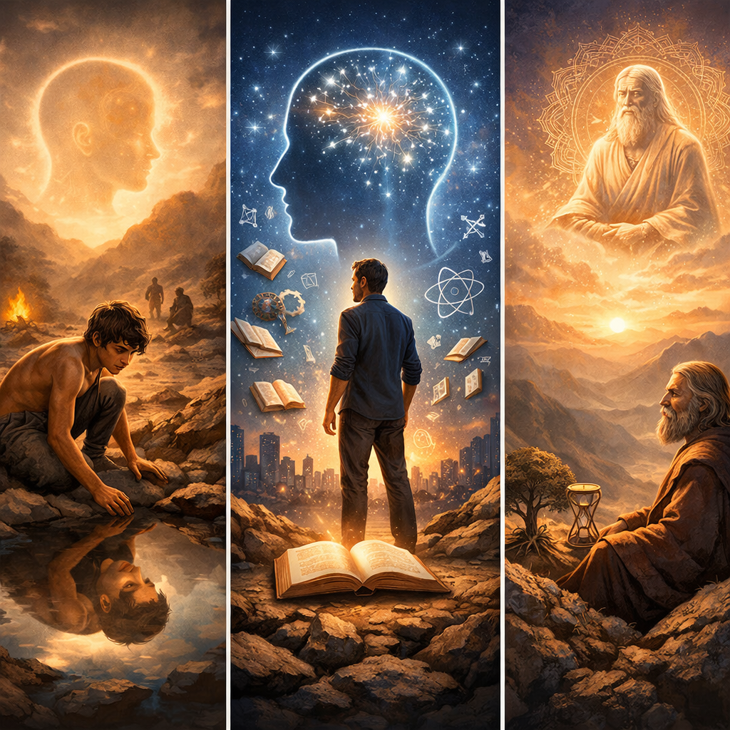 До того, как существо стало человеком (то есть, животное существо), никакое осознание самого себя не существовало. Не время, не пространство для таких существ не имеет смысла. Пространство для них, это просто ареал их охоты, но это не ощущение пространства. Время для них, это просто какой-то промежуток между голодом и сытостью, а потом сытостью и голодом (а более крупно – между рождением и смертью, хотя ни рождение, ни смерть, как таковые, ими не осознаётся), но не ощущение времени. «Осознание» для них, это привыкание к определённым видам вокруг, в которых животное чувствует себя в относительной безопасности и возможности добывать пищу, но это не осознание себя. Не стоит обольщаться проявлениями животными признаков разумности (например, хитрость, привыкание к человеку, дружба с другим видом животных, проявление благодарности) – они не выходят за пределы сказанного. Если животное покормить, оно знает, что тут можно добыть еду. «Хитрость», это выполнение команд коллективной души, обеспеч