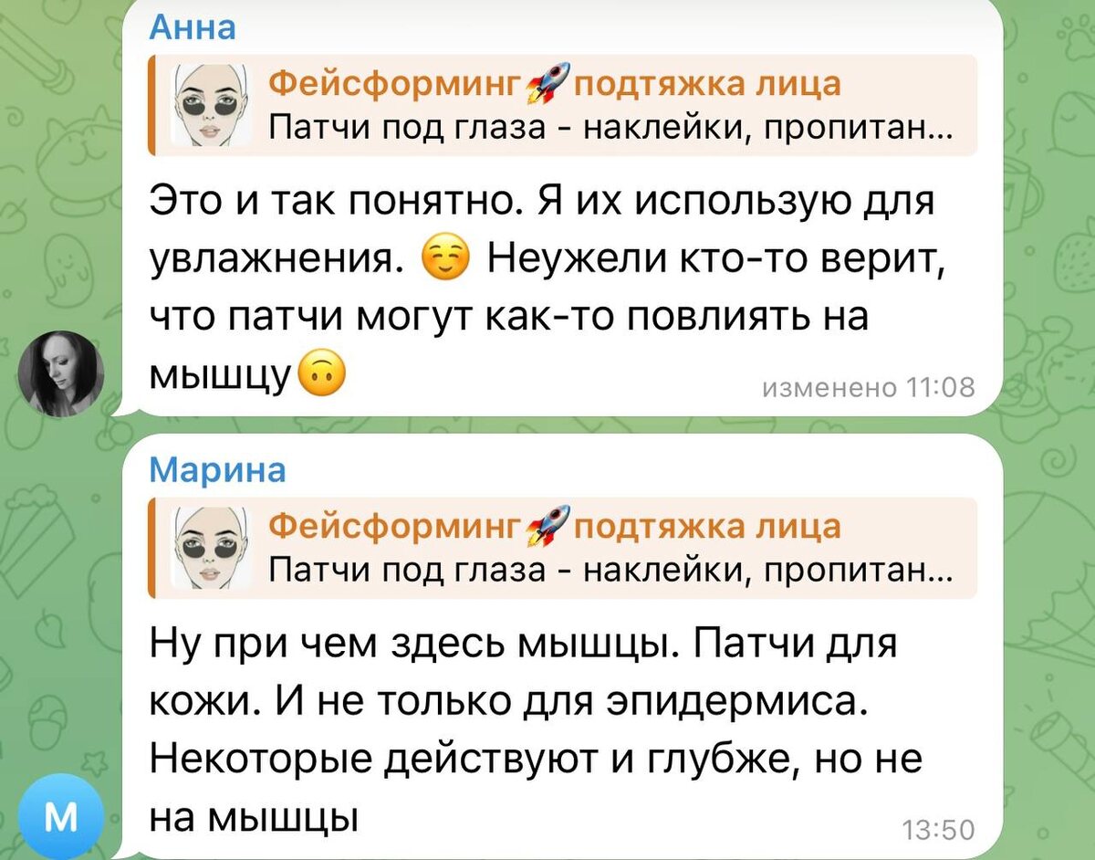 🙏🏻 Суть в том, что используя патчи, решая начать это делать девушка думает, что улучшает состояние под глазами. А это не так. Поэтому и говорю о мышцах, костях, связках. Состояние кожи в зоне глаз результат того, в каком состоянии ткани под ней (мышцы, связки, кости). Причиной по которой начинают использовать патчи часто являются запросы (ухудшенное состояние) в зоне глаз. Очень редко ими пользуются так просто для удовольствия. А в качестве увлажнения тоже сомнительный эффект ведь большой риск получить локальный отек и в последствии утоньшение и без того тонкой кожи под глазами - дряблость, мелкие морщины. Если здесь добавится общее похудение кожа под глазами повиснет.