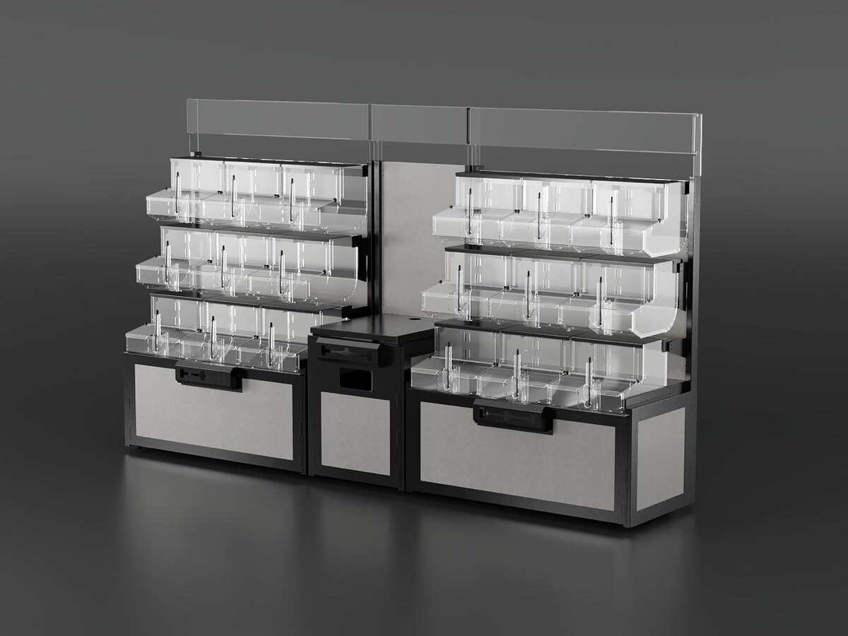 диспенсеров AirBox XL Габаритные размеры: 600мм(г)*3000мм(д)*1800мм(в) включая топпер Комплектация: Модуль Изобилие L-1200 - 2 шт Модуль Изобилие L-Весы - 1 шт Каждый модуль разборный, оснащен выкатной независимой зоной хранения, рулонным пакетодержателем, информационным топпером AirBox XL - 18 шт https://dzen.ru/media/betaplastpro/rotacionnyi-konteiner--dispenser-airbox-xl-699ad61634985f090071f3e2 Варианты цвета рам модулей: RAL 9005, RAL 9006, RAL 7024, RAL 7038 Варианты цвета МДФ вставок модулей: серый, черный, дуб Сонома Также доступны другие комбинации цветовых решений по запросу #Изобилие