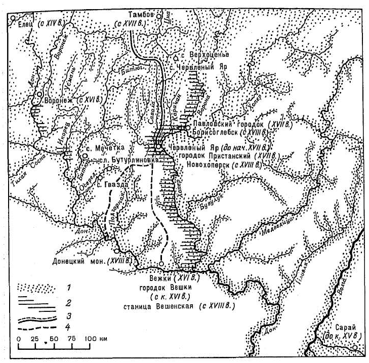 Третье. Относительно пределов Червлёного Яра, то со времени Иловайского стало популярным представление, что она включает всё обширное пространство междуречья Дона и Хопра. Но из самих источников это совсем не следует. Караулы по Хопру до Дона значатся отдельно от Червлёного Яра, а о районе Воронежа в грамотах нет и помину. Современные исследователи (Шенников) обнаружили на Дону несколько конкретных мест с названием Червлёный Яр. Но это не доказывает наименование для всей обширной территории междуречья. Название весьма популярное. Достаточно вспомнить, что в более современном варианте (Красный Яр) на Волге и в Сибири имеются десятки мест с таким названием. Так что вполне может быть справедливой версия о том, что Червлёный Яр был лишь сравнительно небольшой областью в районе рек Ворона и Савала.