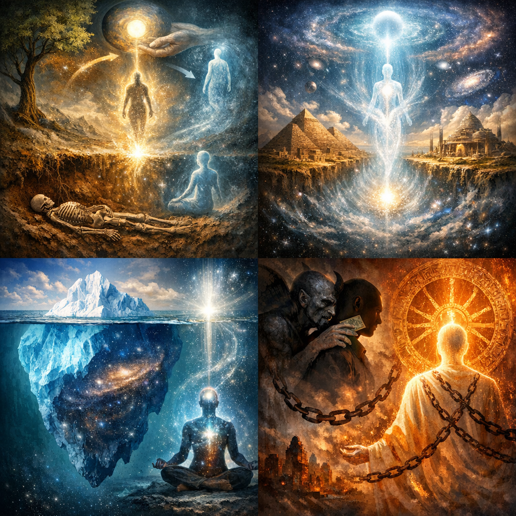 Также, как уровень потенциала, достигнутый человеком в предыдущей жизни, сохраняется и переносится в следующую жизнь через душу (т. к. тело истлевает и распадается), так и некая Мировая Душа сохраняет и переносит уровень и потенциал Творения, достигнутый в предыдущей Фазе Творения, в последующую. Процесс аналогичен – что вверху, то и внизу. Когда говорят, что человек – это образ и подобие божие, то надо иметь в виду не тело (тела разных разумных существ могут быть различны, а Процесс (в том числе и тот, о котором сказано в предыдущем абзаце). Равно, как и наивысшей сутью Мироздания является Процесс, а не сущность. Всё, что мы знали, знаем и будем знать, как конвенционально научное, это едва ли 1% нашей Вселенной, и если мы не выходим за пределы конвенциональной науки, то мы никогда не узнаем остальные 99%. Люди, которые продают знания, полученные ими посредством ченнелинга, за деньги, это люди, которые или нарушают духовно-энергетический закон, или люди, которое придуманное ими же сами