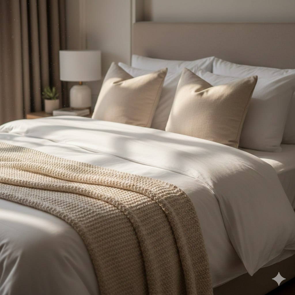 ₽? 🤫 В отеле кровать выглядит королевской, а дома — просто «постелью». Секрет не в ремонте, а в том, КАК заправлять. 3 лайфхака горничных для объема и уюта: 1️⃣ «Отельный подворот» Не натягивайте одеяло до подушек! Отогните верхний край на 30-40 см вниз. Подушки положите ПОВЕРХ простыни, но НАД отворотом одеяла. Это создает объем и многослойность. 2️⃣ Подушки вертикально Не кладите их плашмя «блинчиками». Поставьте вертикально к изголовью и взбейте. Если есть декоративные — поставьте перед основными. Кровать сразу выглядит выше и торжественнее. 3️⃣ Плед в ногах Бросьте плед только на изножье (нижняя треть кровати). Не застилайте им всё! Пусть лежит небрежными складками — это добавляет текстуру. 💡 Итог: Спальня преобразится за 2 минуты. Попробуйте сегодня! А если белью уже ничего не помогает... За новым (плотным и идеальным) ждем вас: 📍 Старая Купавна, ул. Чехова д.4