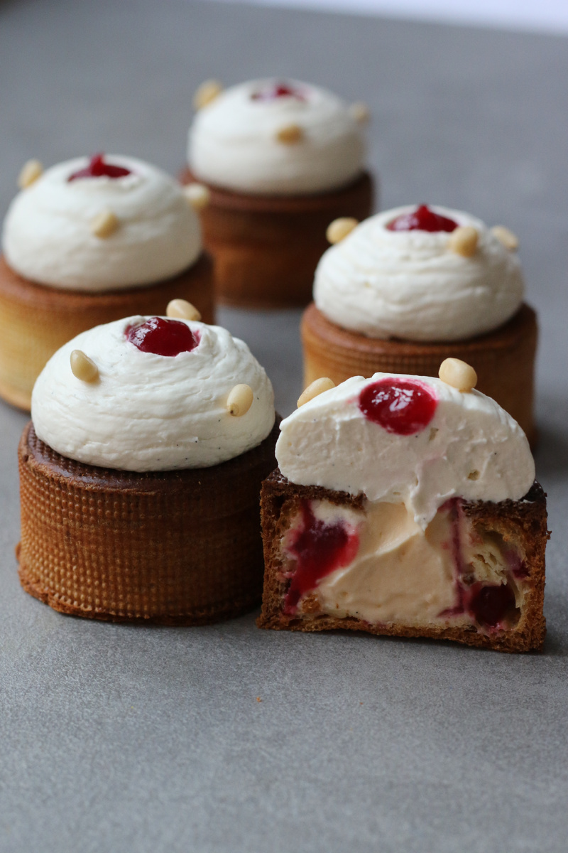Соль – 3г В сотейнике соединить воду, молоко, нарезанное кубиками масло, соль и сахар. На среднем огне довести до кипения и влить в дежу с мукой. Перемешать до однородности, чтобы тесто не прилипало к стенкам посуды. Затем вернуть на огонь и, постоянно помешивая, довести тесто до 80°С. Вернуть тесто в дежу, при помощи насадки «лопата» перемешивать на средней скорости до 50°С, затем постепенно влить яйца, вымешать. Тесто должно свисать треугольником с лопаты. Дать тесту отдохнуть 2 часа. Формы (круг 8 см) для тартов застелить полосками из перфорированного коврика, заполнить тестом на треть, сверху накрыть еще одним ковриком, уложить противень с прессом и выпекать при 175 °С 40-50 минут, режим конвекция Заварной крем: Молоко – 310г