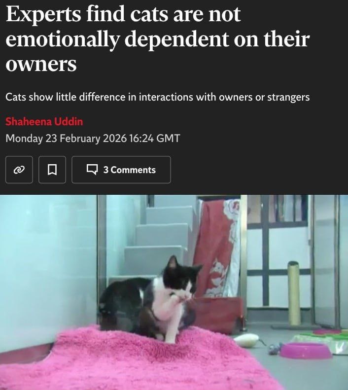 В стрессе они надеются только на себя, мяукают из-за скуки или голода, спят рядом ради тепла и еды, а хозяина от незнакомца не отличают. Никакой привязанности, только выгода. Учёные выяснили, что коты, в отличие от собак, не формируют никаких эмоциональных привязанностей к людям. В стрессовой ситуации кошки не ищут защиты у человека, а полагаются только на себя. В тестах кошки вели себя одинаково рядом с хозяином и незнакомцем: уровень тревоги и уверенности не менялся.