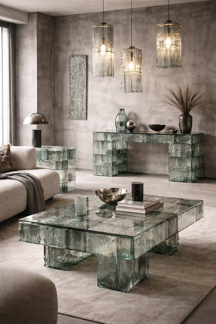 - Консоли — узкие стеклянные столики (в прихожей, за диваном). Функционально (положить ключи, телефон, декор), но не массивно.