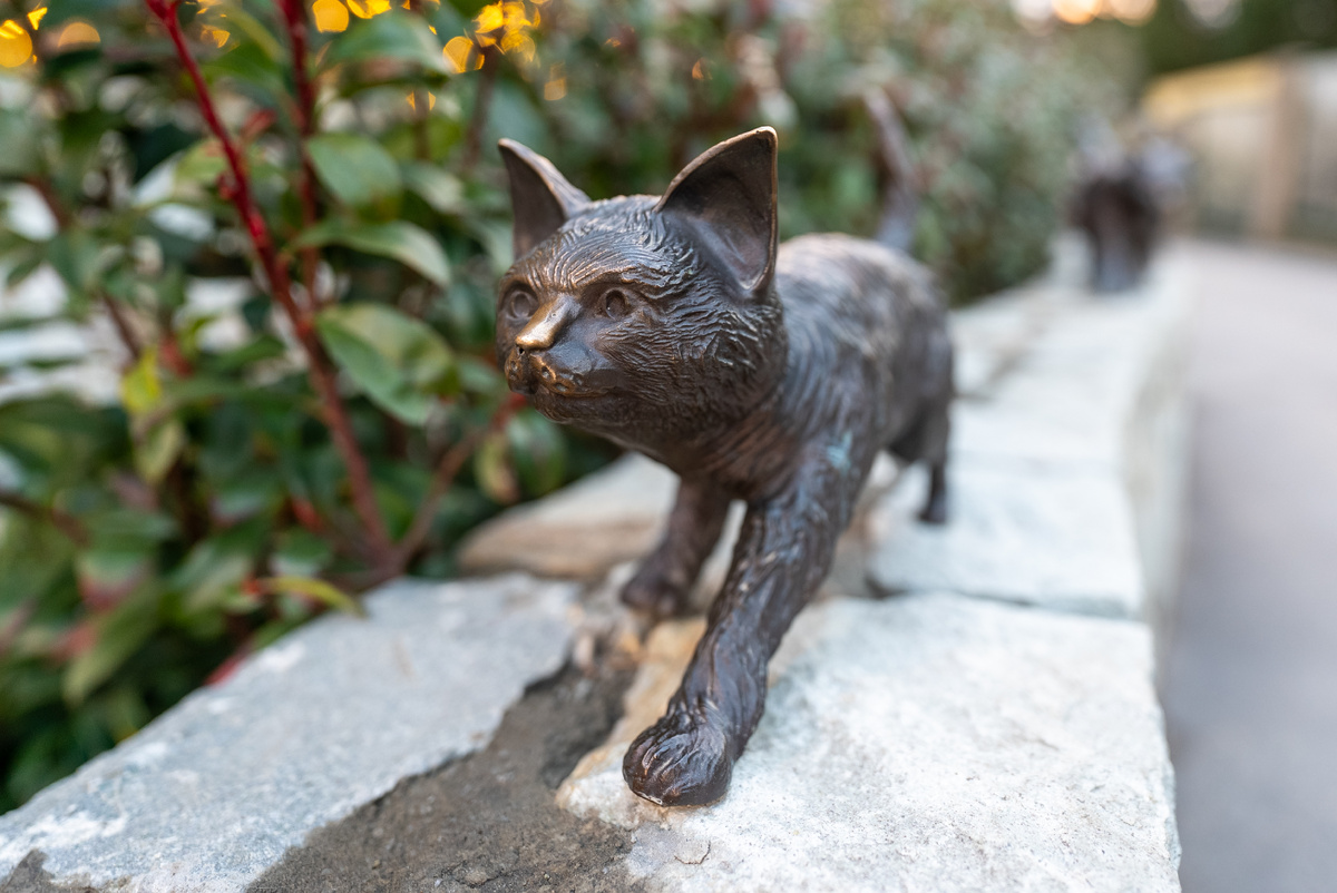 Он задуман как полноценное семейное пространство: здесь есть детские площадки, качели, лазалки и канатные (верёвочные) элементы. Также на территории — туалет, кафе, фонтан и спортивная площадка с тренажёрами для взрослых. И первое, что ловит взгляд (и, конечно, детские руки) - это бронзовые котики у входа. Такие гладкие кошачьи носики, отполированные тысячами прикосновений. Дочка тут же к ним - гладить, обнимать, разговаривать и фотографироваться. Я тоже не удержалась и потрогала. Дочка тут же распределила, кто мама котик, кто папа котик и кто их детки. Мы приехали в Алупку ближе к вечеру- в то самое время, когда день уже мягко скатывается в сумерки, и парк начинает зажигать свои огоньки. Хотелось просто немного пройтись и дать ребёнку побегать.