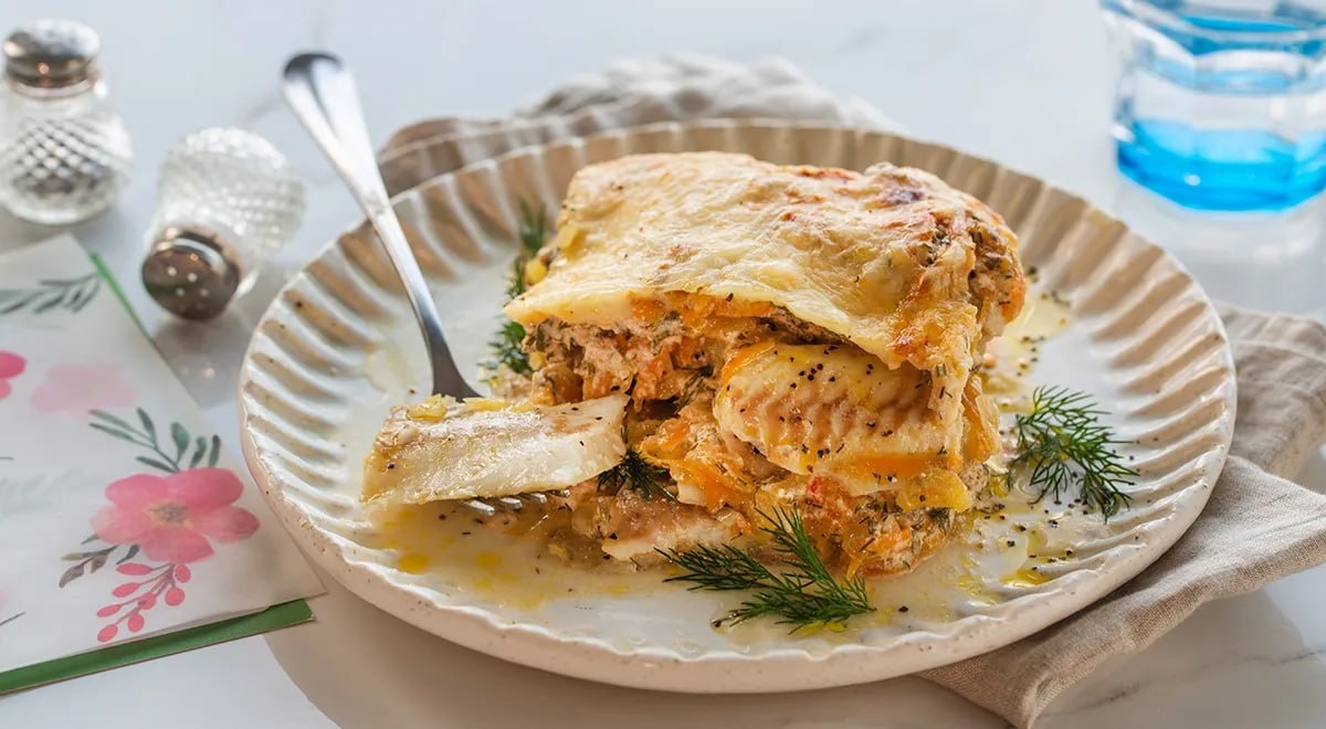 » 🐟 Нежное филе минтая, спрятанное под овощной «шубой» и сметанно-томатным соусом с сыром. Простой и элегантный ужин без майонеза! 📖 Ингредиенты: - Филе минтая — 600–700 г - Лук репчатый — 1–2 шт. - Морковь — 1–2 шт. - Сметана — 200 г - Томатный соус — 3–4 ст. л. - Сыр (твердый) — 80–100 г - Зелень (петрушка, укроп) — небольшой пучок - Растительное масло — для жарки - Соль, черный перец — по вкусу 🧑🏻🍳 Приготовление: 1. Подготовка: Рыбу заранее разморозьте в холодильнике (лучше с вечера). Лук мелко порубите, морковь натрите на крупной терке. Зелень измельчите. 2. Овощи: На сковороде с маслом обжарьте лук с морковью на небольшом огне до мягкости (не зажаривайте). Дайте овощам остыть. 3. Сборка: Филе минтая нарежьте порционными кусочками, выложите в форму для запекания. Посолите, поперчите. Сверху равномерно распределите обжаренные лук с морковью. 4. Соус: Смешайте в миске сметану, томатный соус и рубленую зелень. Посолите, поперчите по вкусу. Залейте этим