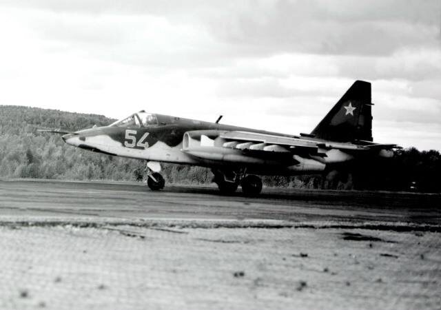 Штурмовик Су-25 из состава 279-го МШАП, ВВС Северного флота (на фото одна из сравнительно новых, на то время, машин 10-й серии); 1990-91 годы.