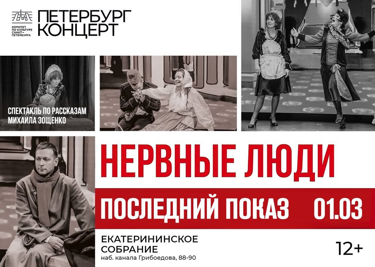 Приглашаем вас на финальный показ спектакля «Нервные люди» по произведениям Михаила Зощенко. Режиссер Борис Войцеховский мастерски перенес на сцену тонкий юмор и иронию великого сатирика. Это постановка о каждом из нас: о порывах чувств, нелепых ситуациях и поиске собственного достоинства в непростых обстоятельствах. Два действия непрерывного смеха. «Нервные люди» — спектакль способный рассмешить даже того, кто уже давно разучился улыбаться. Успейте увидеть эту пронзительную постановку про жителей коммуналок, в которых можно узнать нас самих! 01.03 | 19:00 | Екатерининское собрание