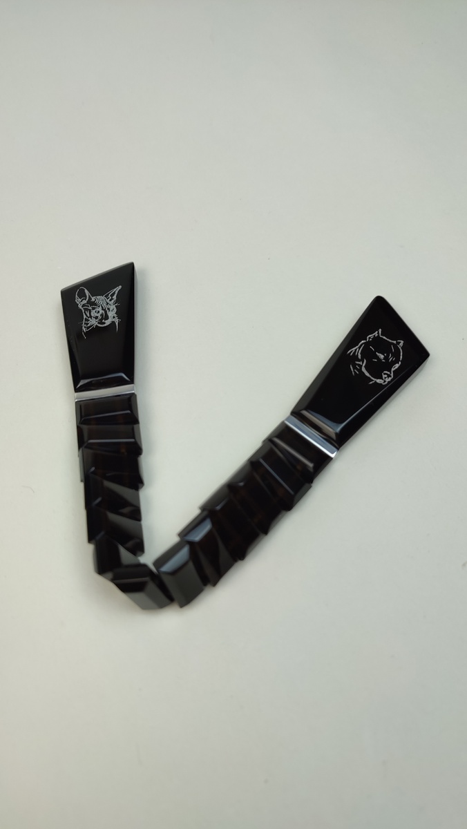 Гравировка нанесена на четыре поверхности из четырёх, содержит в себе четыре эскиза. Глубокая чёрная основа без лишних деталей — строгая, сдержанная, уверенная. Главный акцент здесь — гравировки на окончаниях: два хищника. Тихое напряжение, момент перед движением. Форма звеньев даёт чёткую тактильность — чётки ощущаются собранными и «боевыми» в руках. Ничего лишнего, только характер. Модель получилась минималистичной, но с сильным настроением. Для тех, кто любит строгие вещи с внутренним смыслом. Возможна версия на заказ с другими символами или персональной гравировкой.